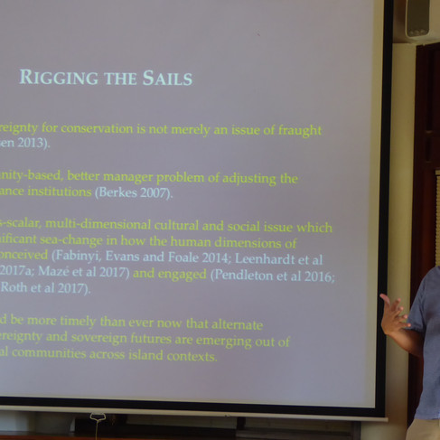 Ce séminaire, organisé les 22 et 23 mai 2018 par le Secrétariat permanent pour le Pacifique, le CRIOBE et la Maison des Sciences de l’Homme du Pacifique, a permis de réunir des scientifiques, organisations non-gouvernementales et services publics gestionnaires d’aires marines de Polynésie française, des îles Cook et de Hawaï. L’objectif du séminaire consistait à confronter les points de vue et les expériences sur la mise en place de grandes aires marines gérées / protégées dans ces archipels polynésiens: aux Iles cook, aux îles Kiribati et en Polynésie française en particulier, pays frontaliers maritimes, qui disposent d'importantes ZEE.